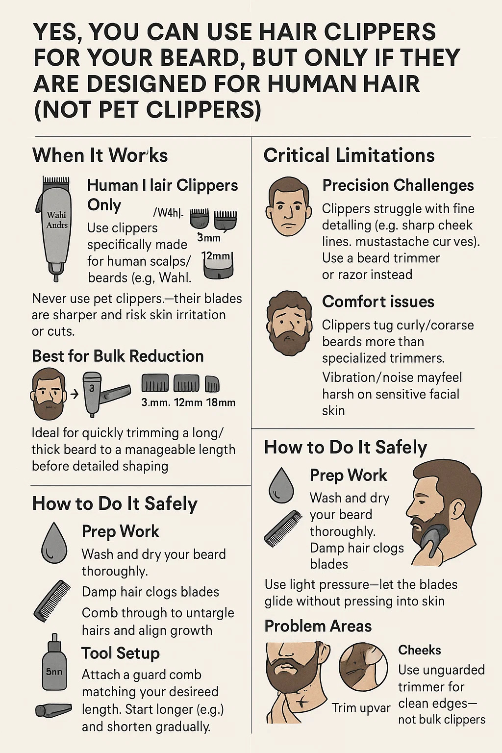 Da, puteți folosi tunsori pentru barba ta, dar numai dacă sunt concepute pentru părul uman (nu pentru mașinile de tuns animale de companie). Iată un ghid detaliat, practic: