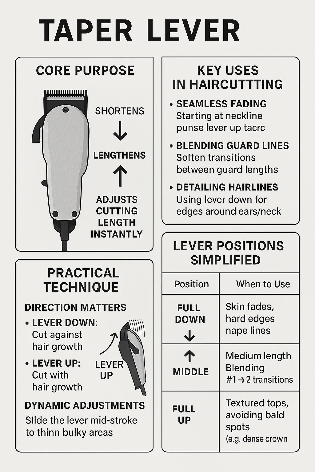 Detalificarea companiilor de păr: folosiți pârghia în jos pentru margini crocante în jurul urechilor/gâtului; Pârghiați pentru finisaje mai moi, naturale.